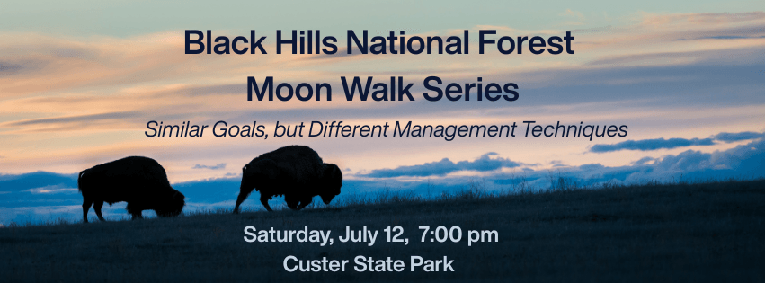 July Black Hills National Forest Moon Walk: Similar Goals, but Different Management Techniques Speaker: Lydia Austin / Visitor Services Program Manager Location: Custer State Park – South Dakota, Game, Fish and Parks Dept., Custer State Park – Buffalo Corrals (Wildlife Loop Road) Back by popular demand ... As many local outdoor enthusiasts know, Custer State Park is home to an array of wildlife species, many of which are also found on the Black Hills National Forest. Although both agencies manage habitat for the conservation of species, the techniques are sometimes different from one site to another. Take a hike with park staff and Forest staff in the southern portion of Custer State Park and learn how both agencies work together toward common goals. NOTE: This walk takes place in a mixed grass prairie on uneven terrain. Participants are encouraged to wear sturdy shoes or boots.