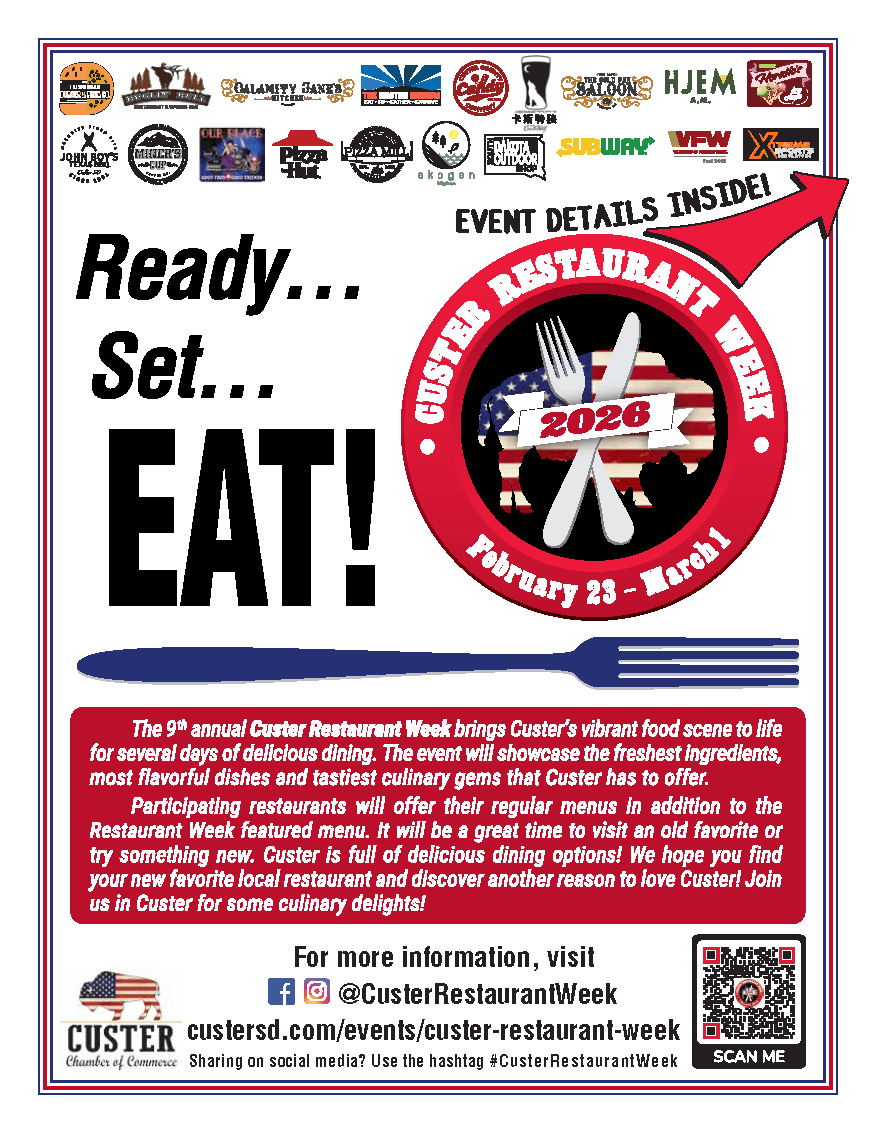 Participating restaurants will offer their regular menus and the Restaurant Week featured menu. It will be a great time to visit an old favorite or try something new. Custer is full of delicious dining options! We hope you find your new favorite local restaurant and discover another reason to love Custer! Join us in Custer, February 23- March 1, 2026, for some culinary delights!